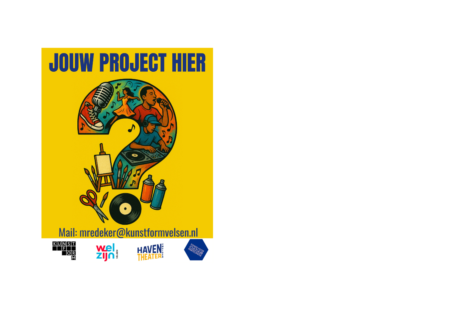 Heb jij een creatief idee of wil je graag deelnemen aan een van de lopende projecten? Neem contact op via mredeker@kunstformvelsen.nl